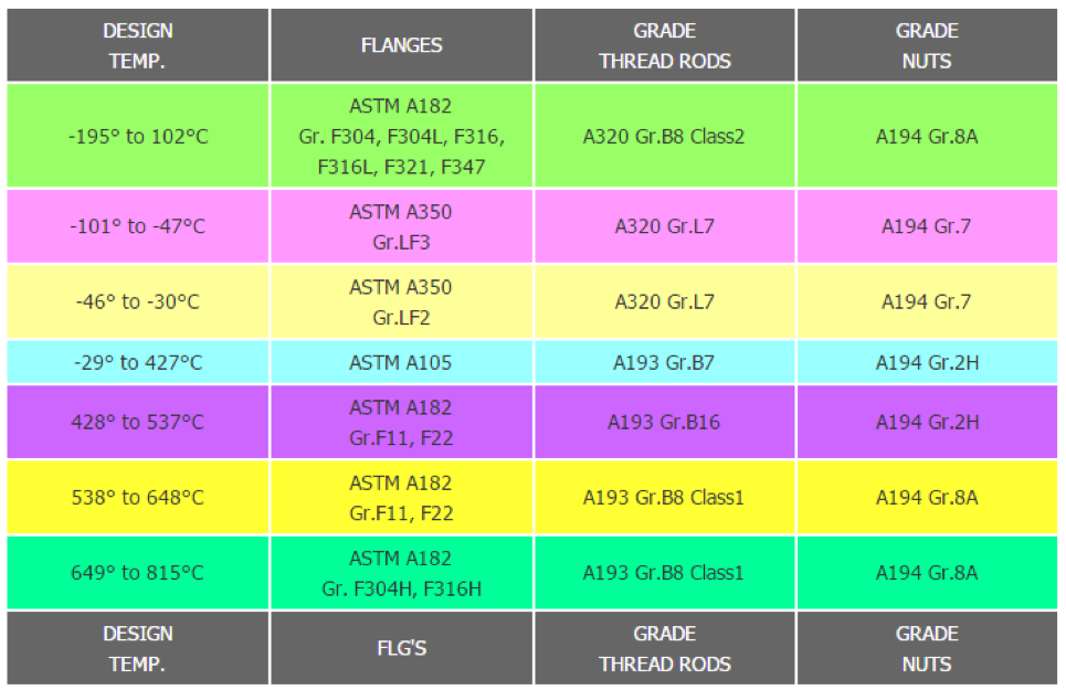 Dimensions from Stud Bolts are defined in the ASME B16.5 standard. The material qualities for studs are defined in the different ASTM standards, and are indicated by Grade. Frequently used grades are A193 for thread rods and A194 for the nuts.